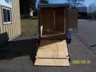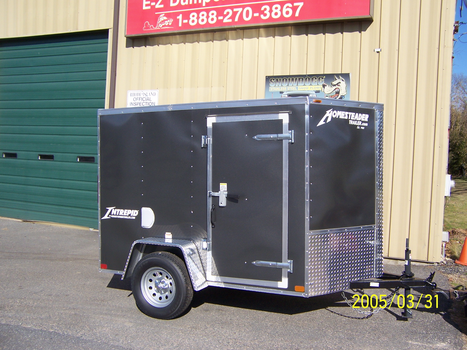 Homesteader Intrepid enclosed trailer. Vee nose, 9'8" floor space, ramp door w/ flap, 32" side door, roof vent, sidewall vents, 2 dome lights, 4 D rings, drop axle, rear stabilizer jacks, stone guard and lockable doors. Radial tires. L.E.D. lights.