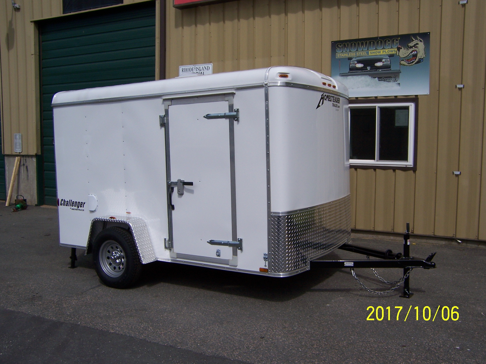 Homesteader enclosed trailer. 6'2" interior height, 3/4" plywood floor, 3/8" plywood walls, barn doors, 32" side door, roof vent, sidewall vents, stone guard, lockable doors and drop axle with 15" Radial tires. L.E.D. lights. CALL FOR PRICING!