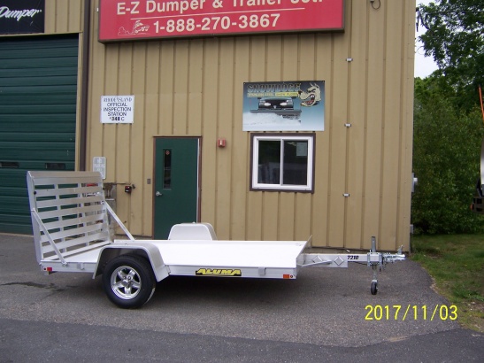 | | Aluma trailers. 72"x10' Extruded aluminum floor, torsion axle, 13" radials with aluminum rims, stake pockets, L.E.D. lights and swivel jack.