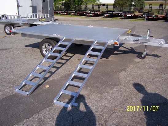 | | Aluma trailers. 2 Place ATV Deck Over, 88"x126.75" Extruded aluminum floor, stake pockets with rub rails, 2 - 12"x69" ramps, torsion axle, 13" radials with aluminum wheels, L.E.D. lights swivel jack.