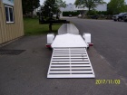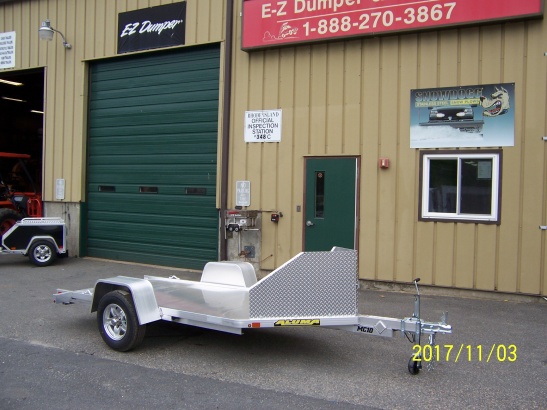 Aluma trailers. Single bike trailer. 51"x138" Extruded aluminum floor, aluminum salt shield with rock guard, wheel chock, 4 HD tie downs, full width slide under ramp, torsion axle, 13" radials with aluminum wheels, swivel jack and L.E.D. lights